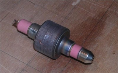 Cette disposition permet de convertir une partie ( importante ) de la puissance des impulsions à récurrence 50 Hz, puissance empruntée au secteur via le transformateur, en énergie très haute fréquence, prélevée dans une des cavités par une petite tige métallique (peu visible sur la photo ) aboutissant à lantenne déjà mentionnée. C'est le queusot lui-même qui sert d'antenne : la petite tige en question est en effet pincée et écrasée dans le queusot au moment de la fermeture du tube. A travers un rudimentaire "cornet" adaptateur et une fenêtre en matière plastique, l'antenne rayonne l'énergie sous forme de micro-ondes dans le four proprement dit.